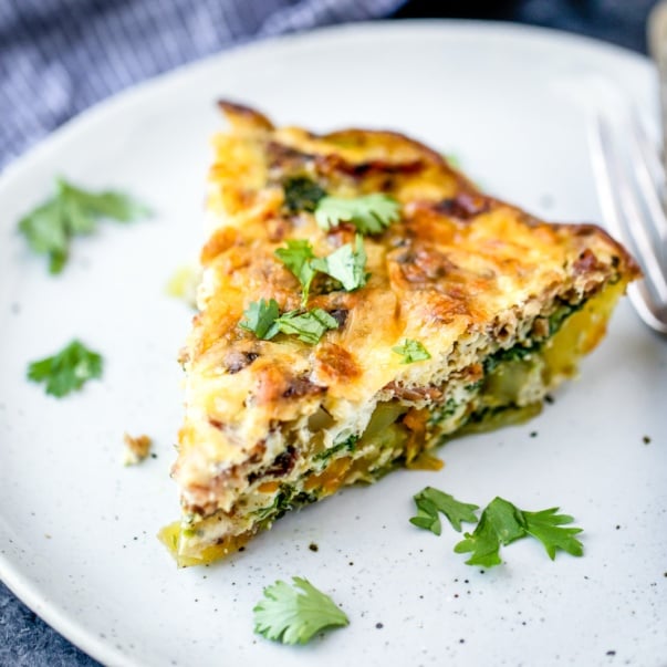 This veggie and protein-packed turkey bacon quiche is the perfect meal prep breakfast! It has an easy potato “crust” to keep it gluten free and a rainbow of veggies like spinach, bell pepper, tomato, jalapeño. Make it and then enjoy slices all week long or freeze it for later!