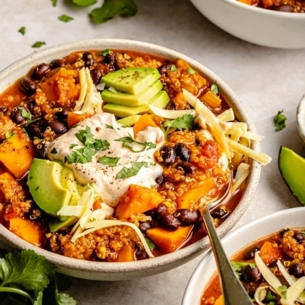 Flavorful, vegetarian chipotle black bean sweet potato chili filled with plant-based protein from two cans of black beans and hearty quinoa. Top with a cooling smoked chipotle greek yogurt creme to take it to the next level! This healthy chili is made in one pot and is perfect for weeknight dinners.